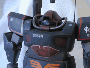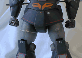 胴体、バックパックはほとんど旧キットのパーツで、脚部はキットのものを ベースに関節やボリュームの変更しています。上腕は市販のポリパーツと ランナーを組み合わせた軸に MGグフの装甲をかぶせてあります。前腕は旧キット のものを幅詰めして利用。肩装甲も旧キットのものです。頭部はモノアイも含めて 固定で、MGドムのパーツをかぶせてあります。パイプ基部は自分の勝手な解釈 で前部はボディーに固定しています。 |